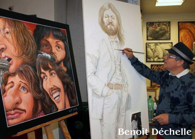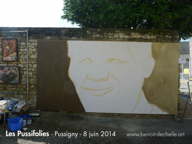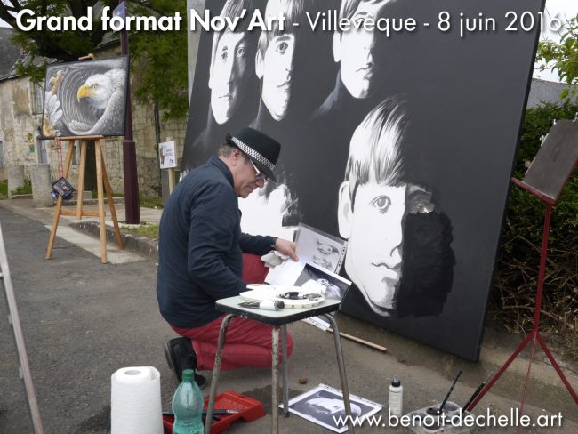 Après le concours de grands formats des Pussifolies du 12 juin dernier, Benoît Déchelle est retourné à Pussigny (37) afin d’effacer les coulures sur dues à l’averse de fin de journée et de peaufiner les portraits des Beatles.