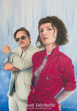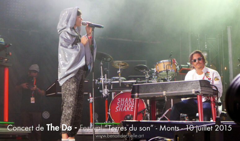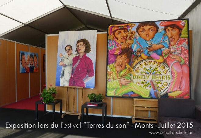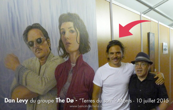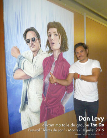 Profitant de la programmation de The Dø au Festival « Terres du Son » le 10 juillet 2015, Benoît Déchelle peint pendant trois semaines un grand portrait du groupe. Trois semaines durant lesquelles les disques « A Mouthful », « Both Ways Open Jaws » et « Shake Shook Shaken » tournent en boucle dans son atelier. Avec d’autres portraits et caricatures de musiciens ou chanteurs, Benoît Déchelle expose cette toile dans l’espace loges des artistes. Après le concert de The Dø, Benoît a la chance de rencontrer Dan Levy qui apprécie sa peinture et le montre aimablement sur les photos.