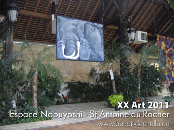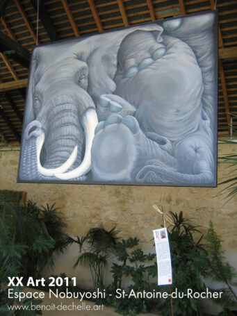 Benoît Déchelle remercie Yannick Mouré et les organisateurs d’XXart de l’avoir retenu pour cette aventure et d’avoir accueilli son « Éléphant coincé » dans la magnifique serre de l’Espace Nobuyoshi.